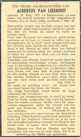 Albertus van Lieshout was vanaf 16-10-1944 tot een onbekende dag van maart 1945 tewerkgesteld bij de firma ‘Reichswerke AG, Hermann Göring’ te Salzgitter-Watenstedt. Hij kwam terecht in Lager 6, dit voormalige kamp voor burgerarbeiders was een soort doorgangskamp waar een arbeidsplaats en de kampaccommodatie werd toegewezen. Tijdens de bevrijding verblijft hij in het kampziekenhuis te Drütte. Hij is echter te verzwakt om naar huis te gaan en overlijdt daar, hij werd op 08-05-1945 begraven op de begraafplaats Jammertal, grafveld VII (rij 6 grafnummer A).
