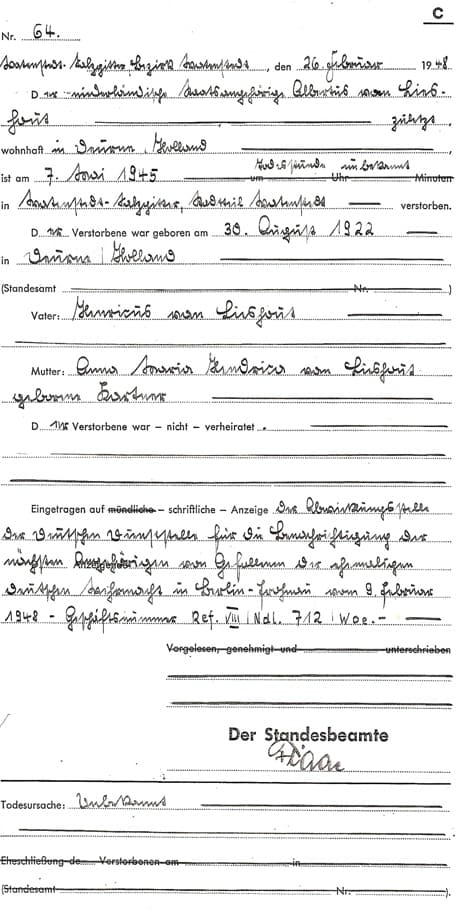 Overlijdensregister (geschreven in ‘Sütterlin’ handschrift)