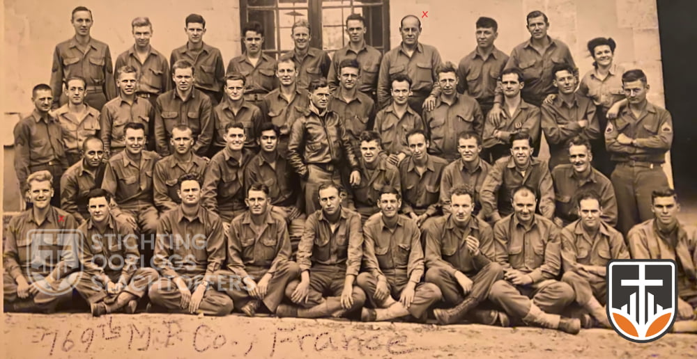 Gruppenfoto (Frankreich 1944): Staff Sergeant Leon M. Hansen oben stehend (mit X). Sergeant Walter J. Staiger unten links (mit X).