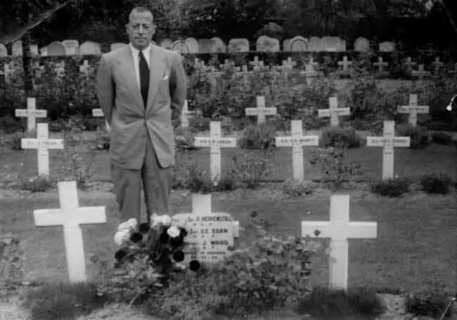 Alf Ward bij het graf van Jack Ward, Percy Heppenstall en Vernon Ernest Egan