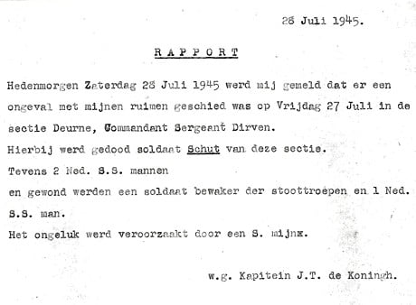 Normaal werkten de mijnenruimers twee aan twee naast elkaar en het volgende paar volgde op een afstand van een meter of tien. Er werd op toegezien dat er overlappend geprikt werd. Achter de woning van Sjaak Mennen, N108 in Neerkant, werd even de veiligheid uit het oog verloren en stonden de mijnenruimers met een groepje te dicht bij elkaar. Ze zouden van plan zijn geweest fruit van de fruitbomen te plukken en daarbij werd op een mijn getrapt. Drie SS’ers waaronder Mathias Hubertus Verheijden, Antonius Johanne van Berkom en Cornelius van Koolwijk werden hierbij gedood. Een Nederlandse soldaat Herman Schutte, collega van Jean Dirven, liep nog een paar passen… zei iets en viel dood neer. Hij had een klein wondje midden op zijn borst, een scherf had hem in zijn hart geraakt.