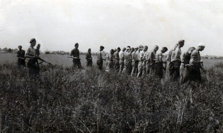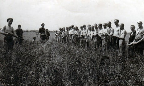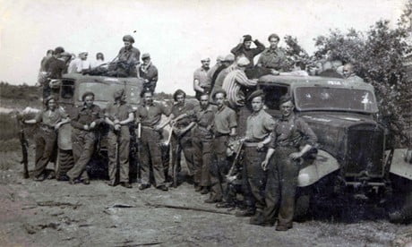 Nederlandse SS’ers uit kamp Vucht bij het mijnenprikken, waarschijnlijk ergens op de Schans in de Neerkant. Ze worden bewaakt door Nederlandse Militairen.