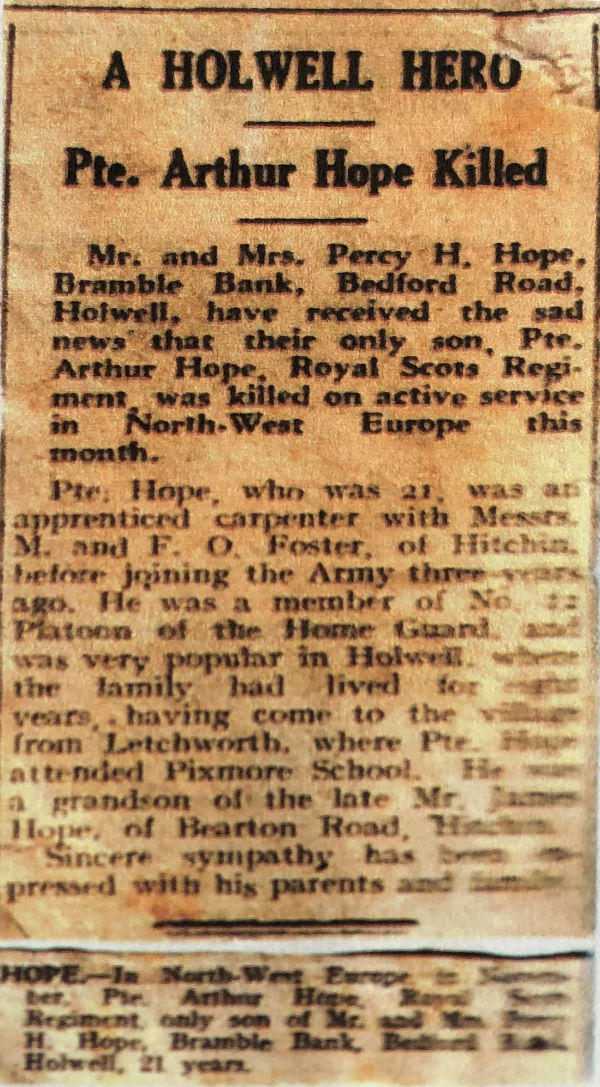 In 2020 nam echter Jürgen Beekers contact met mij op, Jürgen adopteerde het graf van Arthur Hope op het Nederweert War Cemetery, een initiatief van van de Stichting Adoptiegraven British War Cemetery Nederweert. Ook Jürgen kwam in contact met Jeanette Parker-Russell zoals ook het Hitchin Historical Society in Hitchin, naar aanleiding van zijn onderzoek kwam Jürgen aan onderstaande informatie: