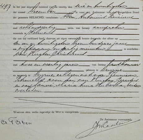 | Doodsoorzaak | : ten gevolge van granaatvuur | |