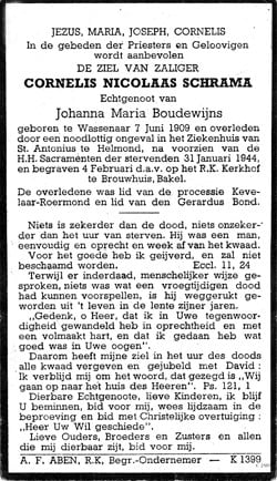 Een dag later, tijdens een zoekactie van de Duitsers naar de bemanning van het vliegtuig werd Cornelis Nicolaas Schrama, 200 meter van zijn ouderlijk huis aan de Rakt B.41, neergeschoten. De Duitsers zagen hem hoogstwaarschijnlijk voor een bemanningslid aan, hij overleed dezelfde dag nog aan zijn verwondingen in het ziekenhuis te Helmond.