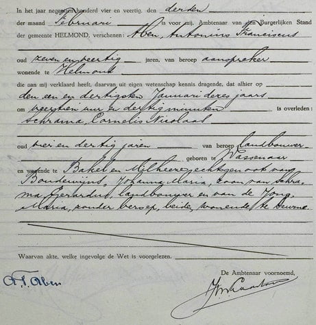 Waarvan de afgelegde ambtseed is opgemaakt dit proces-verbaal geteekend en gesloten te Deurne Vlierden den 1 Februari 1944.”