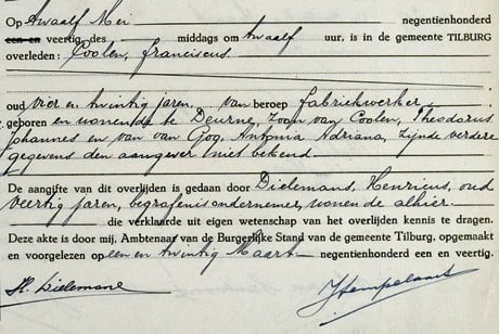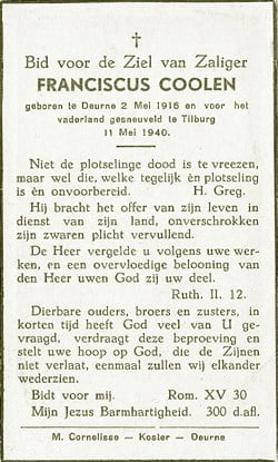 Franciscus Coolen werd naar verluid op 11-05-1940 gedood tijdens de gevechten op de Bredaseweg voor de ingang van het toenmalige Dierenpark en pas op 14-05-1940 gevonden. De doodsoorzaak lijkt dus achteraf geconcludeerd, hij zal onderweg vermist zijn geraakt en uiteindelijk zijn teruggevonden.