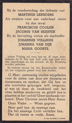 Vermoedelijk sneuvelde Franciscus Coolen dan ook op 12-05-1940, samen met Johannes Hendrikus Beurskens en Gerardus Schoenmakers, toen de brug in de Bosche weg werd opgeblazen. Met de gevallenen bij de dierentuin heeft hij dus niets te maken, hoewel de afstand tussen de Bossche weg en de Bredase niet zo groot was natuurlijk. Het is meer waarschijnlijk dat drie man van hetzelfde onderdeel op één plaats omkomen met één omschrijving terwijl een andere omschrijving over het dierenpark in een verslag is teruggevonden en door een Duitse bomaanval wordt verklaard.