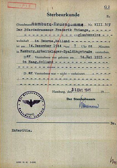 Frederik Nicolaas Thiange werd op 10-03-1943, tezamen met Franciscus Joseph Maria Jacobs, in Deurne opgepakt door de SD (Sicherheitsdienst) omdat zij onderdak verleenden aan Joodse mensen. Op 07-04-1943 kwam hij terecht in ‘KZ Herzogenbusch’ het concentratiekamp te Vught en gezien zijn gevangenennummer vermoedelijk met een transport in midden oktober 1944 vanuit Concentratiekamp Sachsenhausen tewerkgesteld in Lager Spaldingstraße, een buitenkamp van Concentratiekamp Neuengamme. De gevangenen in dit kamp werkten voornamelijk in het gebombardeerde centrum van Hamburg. De werkzaamheden bestonden uit puin ruimen, lijken bergen, het onklaar maken van niet ontplofte bommen en diverse andere herstelwerkzaamheden in het door de Geallieerden gebombardeerd gebied. Frederik Nicolaas Thiange overleed, op 14-12-1944 om 07:00 uur, in Lager Spaldingstraße aan de gevolgen van enteritis oftewel darmontsteking. Deze melding kwam van Gestapo Kriminalsekretär Otto Apenburg, zijn taak was het toezicht op de gevangenen en het camoufleren van moorden.