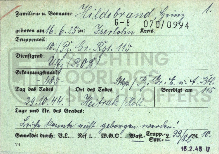 Heinz Hildebrand rust naar alle waarschijnlijkheid “Unter den Unbekannten” op de Duitse militaire Begraafplaats te Ysselsteyn.