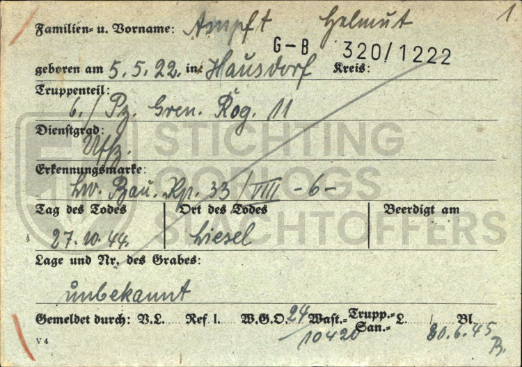 Helaas kon de identiteit van het stoffelijk overschot vooralsnog niet met zekerheid geïdentificeerd worden en werd Helmut Ampft mogelijk als onbekende Duitse soldaat bijgezet op de Duitse militaire begraafplaats te Ysselsteyn.