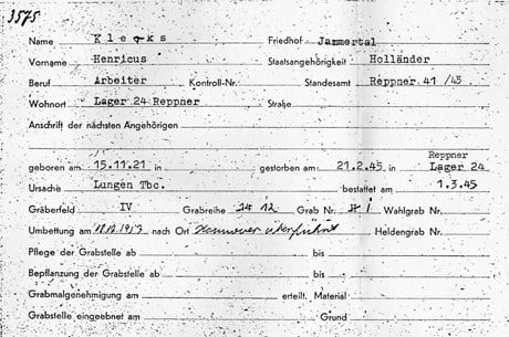 Henricus Klerks kwam in het Todeslager Reppner (Lager 24) terecht waar hij ook overleed, in dit Lager werden onder andere zieke- en arbeidsongeschikte gevangenen geplaatst. De meeste stierven door ontoereikende verzorging of kregen een dodelijke injectie toegebracht. De officiële doodsoorzaak van Henricus Klerks luidt ‘Lungen TBC’ oftewel Tuberculose, hij wordt op 01-03-1945 begraven op de begraafplaats Jammertal, grafveld IV (rij 12 grafnummer I).