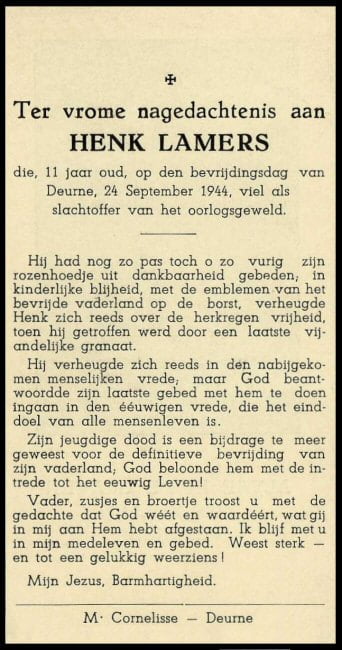 Tekst op bidprentje: “Hij had nog zo pas toch o zo vurig zijn rozenhoedje uit dankbaarheid gebeden, in kinderlijke blijheid met de emblemen van het bevrijde vaderland op de borst, verheugde Henk zich reeds over de herkregen vrijheid, toen hij getroffen werd door een laatste vijandelijke granaat”.