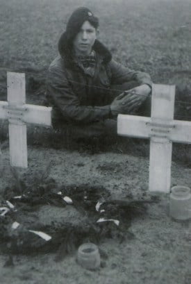 Johannes Andreas (Jan) Hoonings knielend bij de veldgraven van Herbert William Jennings en George Twyneham.