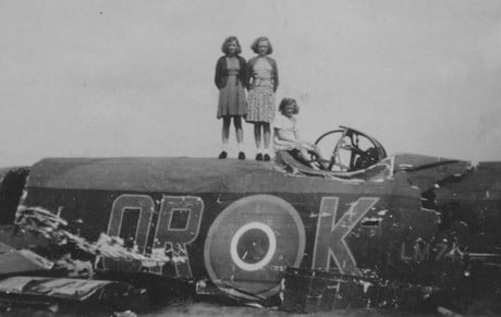 De zusjes Tony, Miet en Ria van Hout op het wrak van de LM718. Gefotografeerd door Leo van Hoek, één van de initiatiefnemers van de herdenkingsplaquette.