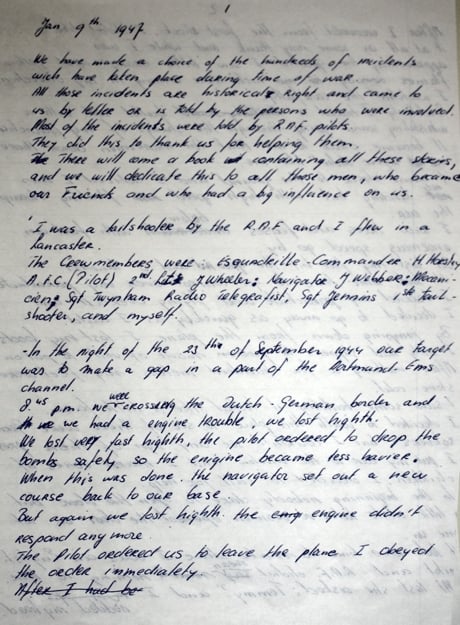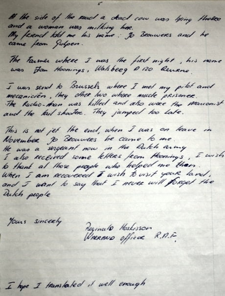 Beneden het verhaal zoals Warrand Officer R.A.F. Reginald Hoskisson deze crash beleefde, hij schreef dit verhaal op 9 Januari 1947 in een dankbrief naar zijn redders in nood. Daarna volgt een Nederlandse vertaling.