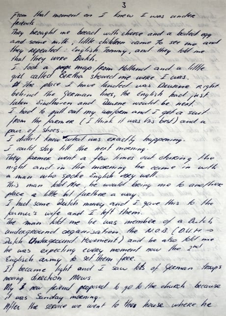 De boer verliet, gedurende de nacht, enkele keren zijn woning en in de morgen kwam hij terug met een man die zeer goed Engels sprak. Hij vertelde mij dat hij me naar een andere lokatie zou brengen, een beetje verder weg. Ik had een beetje Nederlands geld en gaf dit aan de vrouw van de boer en verliet hen. De man vertelde mij dat hij lid was de Nederlandse Ondergrondse Beweging, en ook vertelde hij dat ze ieder moment het 2de Britse Leger verwachtten om hun te bevrijden.