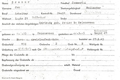 Jan Bremer kwam terecht in een Gestapo Sonderlager, ‘Arbeitserziehungslager Hallendorf’ ook wel Lager 21 genoemd. In dit werkopvoedingskamp binnen de Hermann Göring Werke werden vele gevangenen tewerkgesteld in de zogenaamde “Schlacke-Drütte“, hier werd voornamelijk en zonder beschermende kleding nog gloeiende slak uit de hoogovens kapotgeslagen en verladen. Jan Bremer overleed enkele maanden later, op 22-03-1945 om 16:15, officiële doodsoorzaak ‘Herz- und Kreislaufschwäche’ oftewel door totale verzwakking, hij werd op 27-03-1945 begraven op de begraafplaats Jammertal, grafveld VII (rij 2 grafnummer E). Op 18-12-1953 werd zijn stoffelijk overschot herbegraven naar het Nederlands ereveld te Hannover.