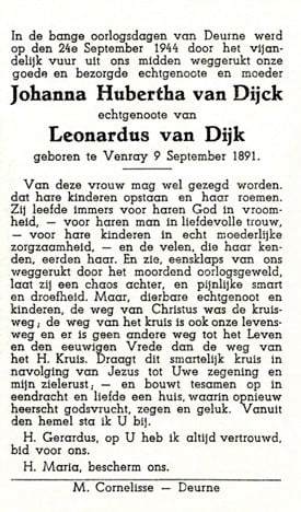 Johanna Huberta van Dijck overleed ten gevolge van granaatvuur door een ingeslagen granaat in haar woning aan het Haageind te Deurne.