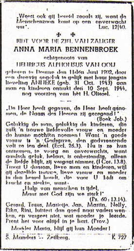 Johanna Maria van Ooij en haar moeder Anne Maria van Ooij-Bennenbroek overleden aan hun verwondingen door een geallieerde luchtaanval op een Duitse goederentrein, tijdens deze luchtaanval werd namelijk ook de woning, aan de spoorbaan, door het mitrailleurvuur getroffen.