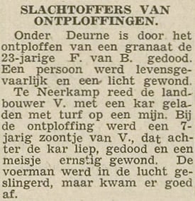 Als de buurman van Martinus Joseph Verstappen met paard en kar terug komt van de Peel, waar hij turf had gehaald voor deze, rijdt hij op een landmijn. Pietje Verstappen is op slag dood en zijn jongere zusje Wies raakt zwaar verwond. Het is één van de mijnen die door de Duitsers niet in een bepaald verband, zoals in een mijnenveld, gelegd zijn en daarom door de mijnenruimers alleen bij toeval ontdekt worden.