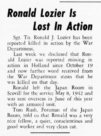 Technician 4 Grade Ronald J. Lozier sneuvelde tijdens het mijnen ruimen toen er een schrapnel mijn ontplofte ten Noord-Westen van Griendtsveen. Robert S. Hart van zijn eenheid wordt op dezelfde dag en locatie vermist.