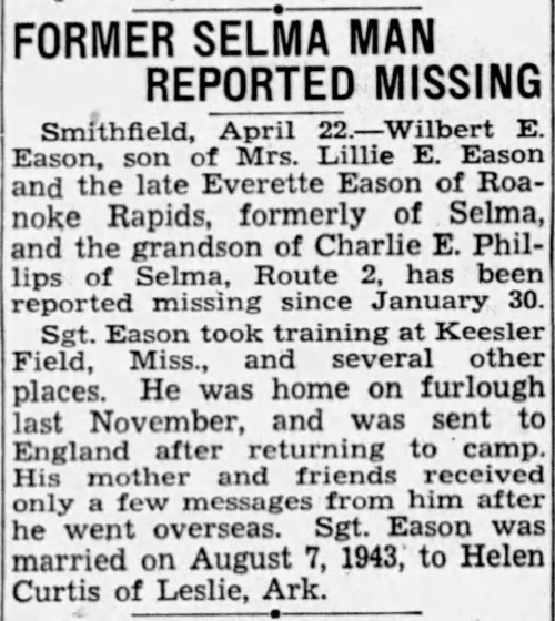 Wilbert E. Eason probeerde het vliegtuig nog met zijn parachute te verlaten maar deze opende niet, waarschijnlijk door een beschadiging van een shrapnel eerder die dag.
