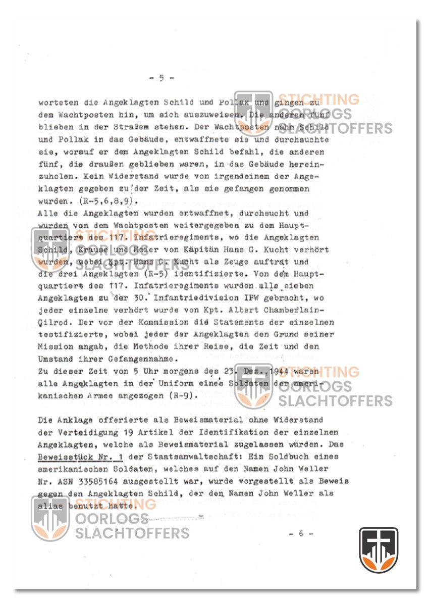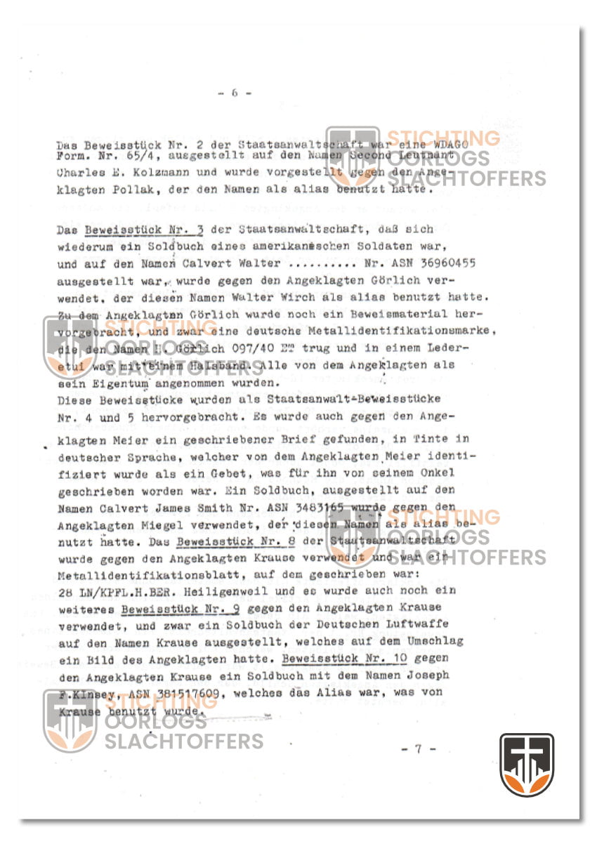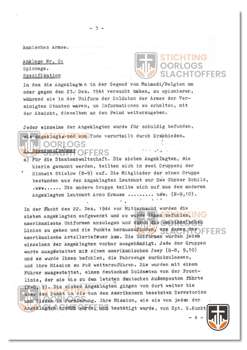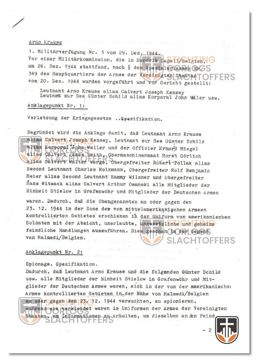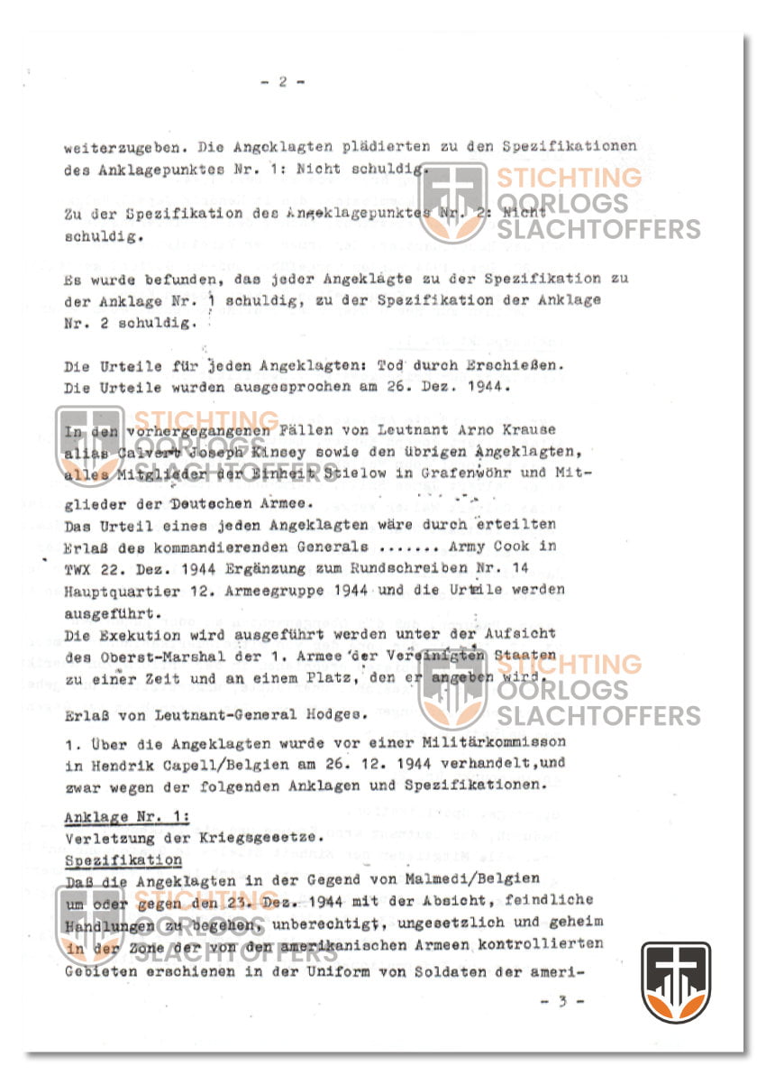 Im Besitz der Angehörigen von Leutnant Krause befindet sich eine, offenbar aus dem englischen, übersetzte und offensichtlich gekürzte Abschrift der Prozessunterlagen. Leider fehlen in der Übersetzung irgendwelche Stempel oder andere Hinweise die Rückschlüsse auf die Herkunft des Schriftstückes zulassen. Ein Begleitschreiben oder Briefumschlag wurden ebenfalls nicht überliefert.