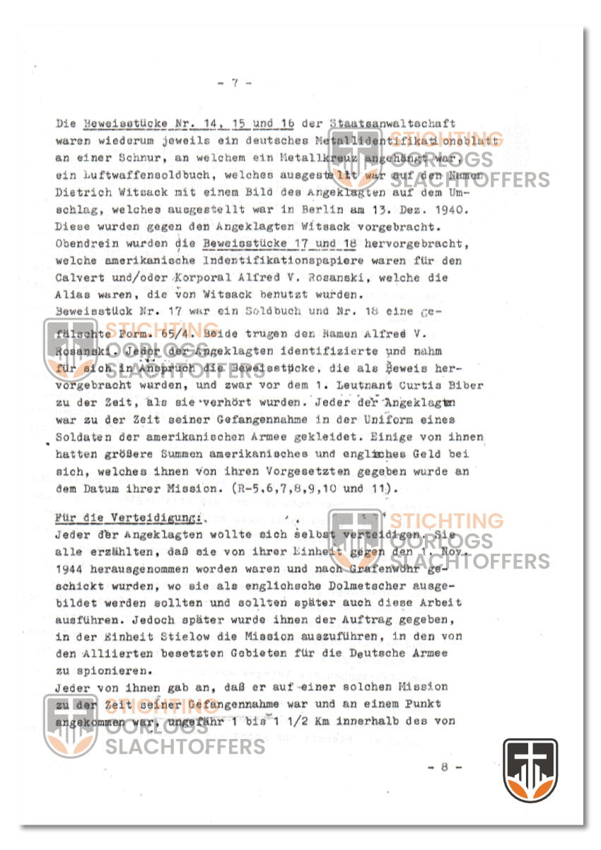 Bisher wurden nur wenige Details aus den Verhören gefangen genommener Mitglieder der Einheit Stielau bekannt. In einem PWI-Report (PWI steht für Kriegsgefangenenverhör) der First Army steht das 4 der Gefangenen Aussagen gemacht haben, Schilz, Meyer, Miegel & Struller. Die anderen beriefen sich darauf Befehle aufgeführt zu haben. Laut Report sagte Leutnant Krause darüber hinaus: „Hätte ich den Befehl bekommen, meine Mutter zu erschiessen, ich hätte es getan“. Dazu wird bemerkt das einige der Gefangenen immer noch eine grosse Klappe gehabt hätten.