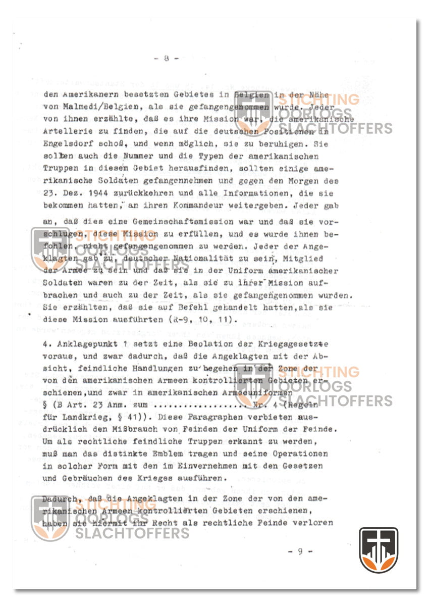 Bestätigt wird im Buch von Mendelsohn das die sieben Soldaten zu Fuss unterwegs waren. Dort wird auch angegeben, dass es sich um das Auskundschaften der Artilleriegeschütze nahe Géromont handelt. Laut Mendelsohn soll es zu einem direkten Kontakt zwischen amerikanischen Artilleristen und den deutschen Kommandosoldaten gekommen sein. Es wird aber nicht vermerkt warum sieben Kommandosoldaten nötig waren um die US-Soldaten auszuhorchen. Wenn viele Einzelheiten zu dieser Gruppe auch zu passen scheinen, es gibt grade bei dieser Gruppe einzelne Punkte in den verschiedenen Unterlagen die zumindest Fragen aufwerfen.