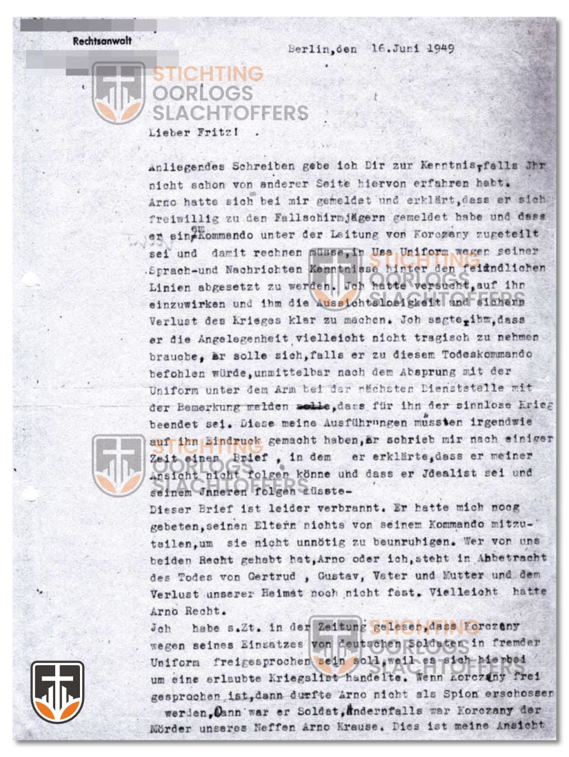 Im Zusammenhang mit Arno Krause dürfte der wichtigste Brief vom 16.06.1949 sein. Dieser Brief stammt von einem Onkel der Rechtsanwalt war. Kurz nach diesem Brief erhielt der Onkel die Gewissheit das sein Neffe Tod ist. Auch über die Umstände wurde der Onkel, von der Deutschen Dienststelle, informiert.