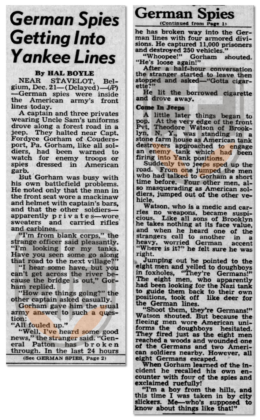 -Deutsche Spione waren heute innerhalb der Frontlinien der amerikanischen Armee. Ein Hauptmann und drei Gefreite, die Uncle Sams Uniformen trugen, fuhren in einem Jeep einen Waldweg entlang und hielten in der Nähe von Hauptmann Fordyce Gorham aus Coudersport, Pa. Gorham war, wie alle Soldaten, gewarnt worden, nach feindlichen Truppen oder Spionen in amerikanischer Kleidung Ausschau zu halten. Aber Gorham war mit seinen eigenen Problemen auf dem Schlachtfeld beschäftigt. Er bemerkte nur, dass der Mann auf dem Beifahrersitz eine Mackinaw-Mantel und einen Helm mit Kapitänsbalken trug, und dass die anderen Soldaten – offensichtlich Gefreite – Pullover trugen und Gewehre und Karabiner mit sich führten.