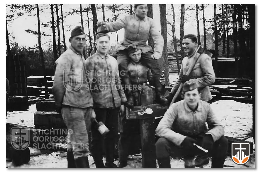 Gruppenbild mit Hans Reich, er trägt einen Kameraden auf den Schultern.