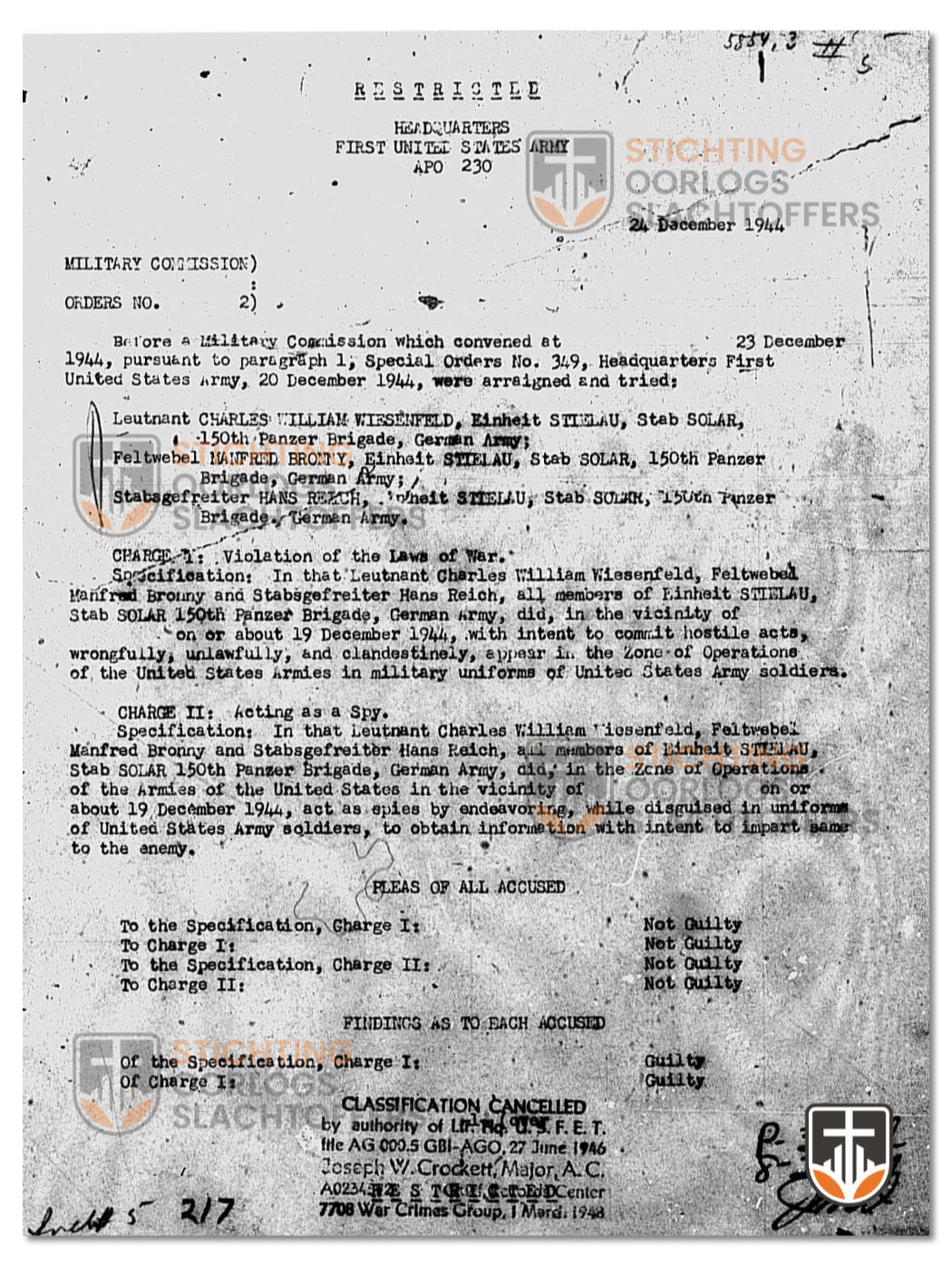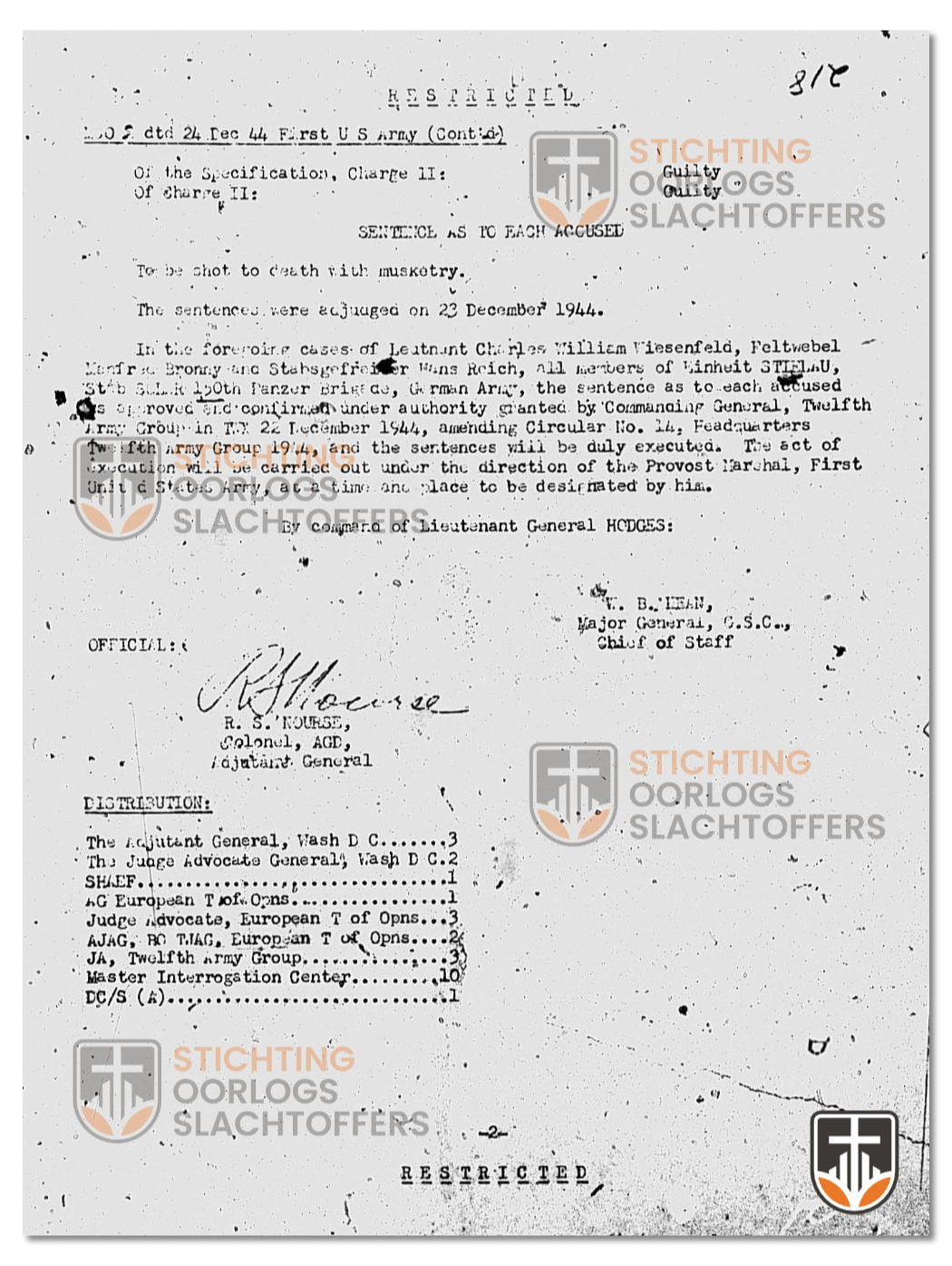 Das Todesurteil gegen Manfred Bronny und seinen Kameraden so wie es sich in der Dachauer Prozeßakte von Otto Skorzeny befindet.