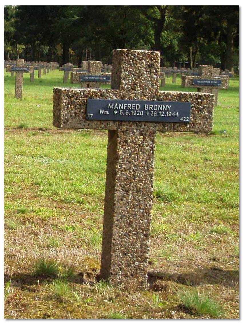 Aus der noch vorhandenen Suchmeldung beim Roten Kreuz in Genf geht hervor, dass Manfred Bronny seit dem 23.12.1944 als vermisst galt. Laut der Suchmeldung vom 07.07.1946 erklärte seine Mutter, das ihr Sohn Manfred bei der Panzer-Brigade 150 eingeteilt war.