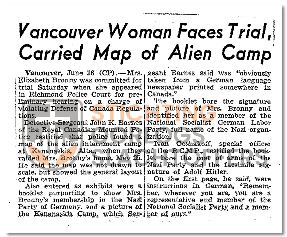 Als weitere Beweisstücke wurden eine Broschüre, die angeblich die Mitgliedschaft von Frau Bronny in der Deutschen Nazipartei belegt, und ein Bild des Lagers Kananaskis vorgelegt, das laut Sergeant Barnes „offensichtlich einer deutschsprachigen Zeitung entnommen wurde, die irgendwo in Kanada gedruckt wurde.“