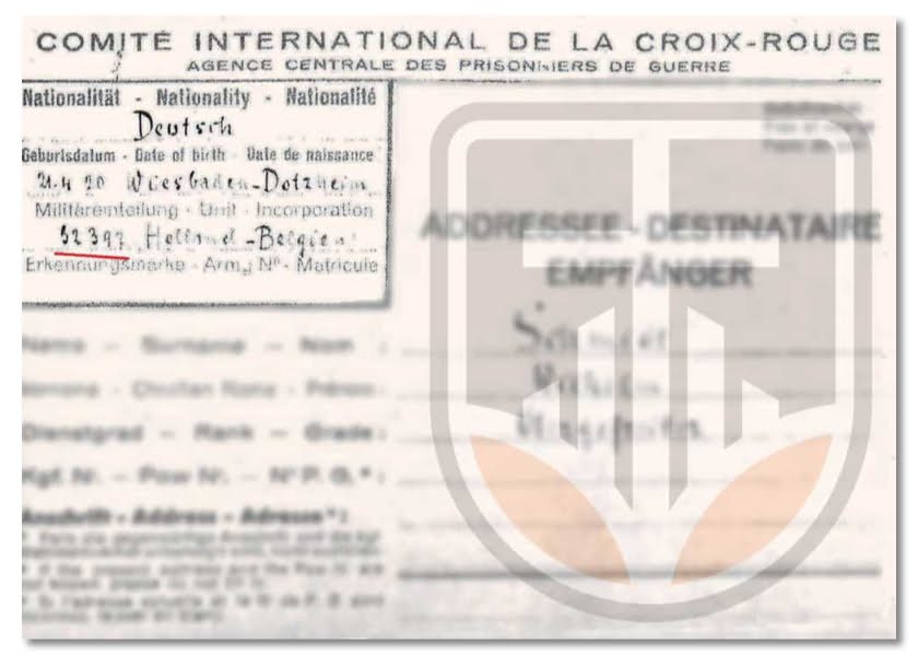 Im Archiv des Roten Kreuzes in Genf fand sich eines der wenigen Unterlagen in Bezug auf Wilhelm Schmidt. Es betrifft eine Karte, die von der Familie im November 1945 an das Rote Kreuz geschickt wurde. Obwohl diese Karte den Zweck hat, kurze Nachrichten an Kriegsgefangene zu schicken enthält diese Karte nur den Absender und den Empfänger, den Obergefreiten Wilhelm Schmidt. Es wurden noch die Geburtsdaten angegeben. Das alles macht diese Karte aber nicht interessant. Als Militärabteilung wird nur eine Nummer angegeben, 32397 Holland – Belgien. Dem Poststempel nach wurde die Karte am 20.11.1945 in Wiesbaden-Dotzheim abgestempelt.