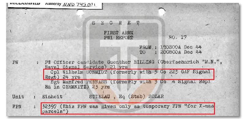 In dem US-Report wird auch die Einheit genannt von der Wilhelm Schmidt kam als er zur Einheit Stielau wechselte. Es war die 5. Kompanie des Luftwaffennachrichten-Regiment 223, in den Niederlanden.
