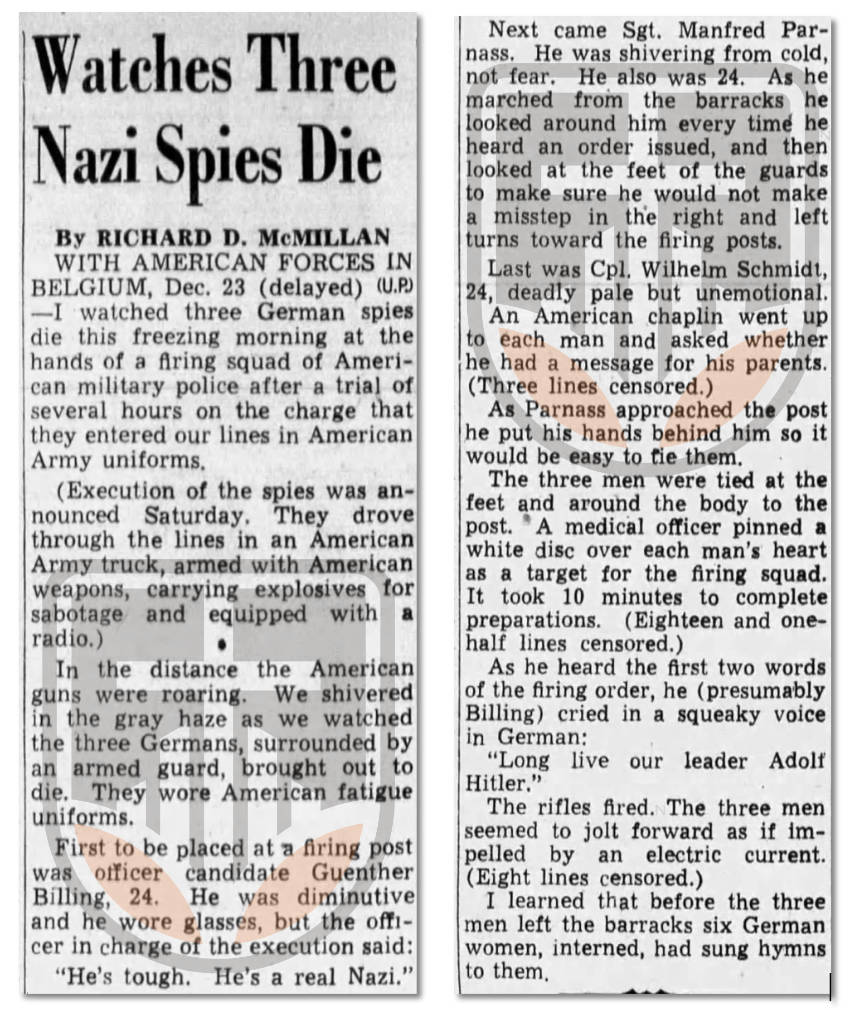 -Ich sah zu, wie drei deutsche Spione an diesem eiskalten Morgen durch ein Erschießungs-kommando der amerikanischen Militärpolizei starben, nachdem sie mehrere Stunden lang vor Gericht standen, weil sie in amerikanischen Uniformen durch unsere Frontlinie eingedrungen waren.