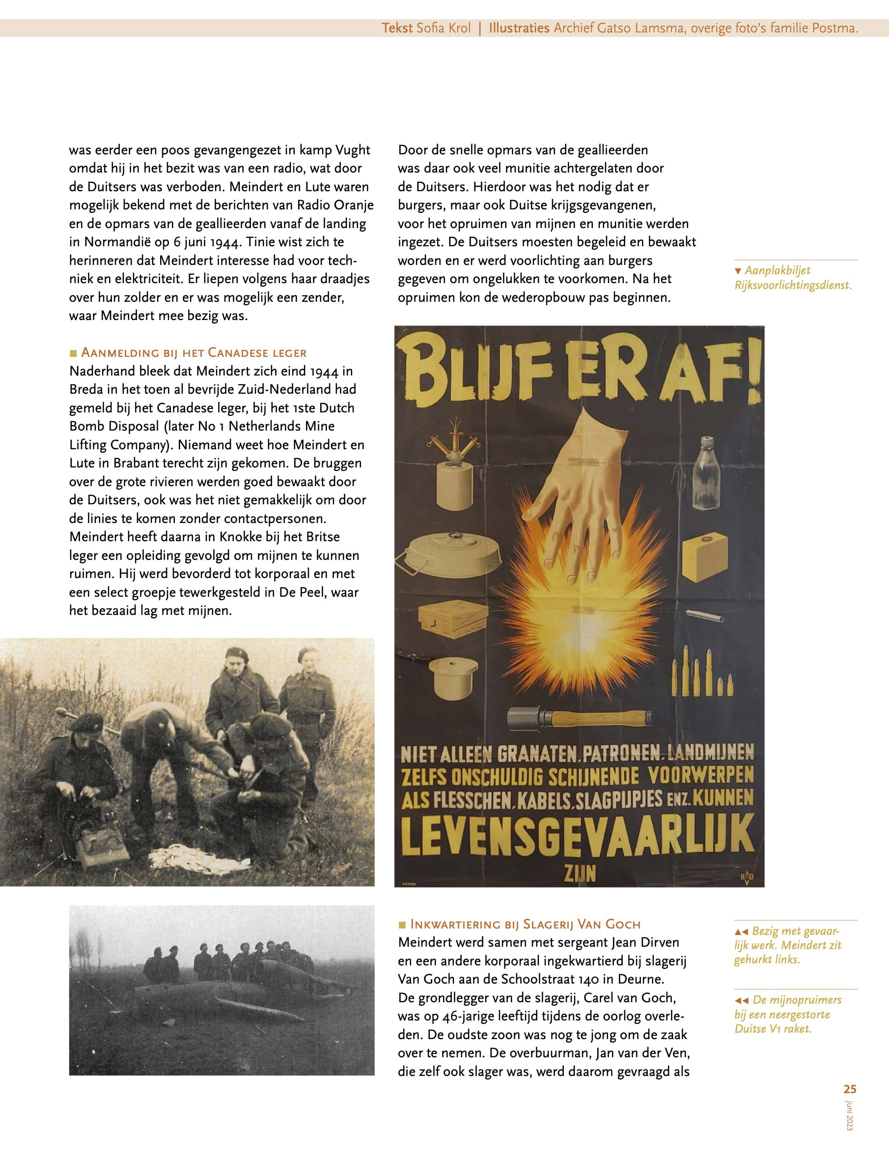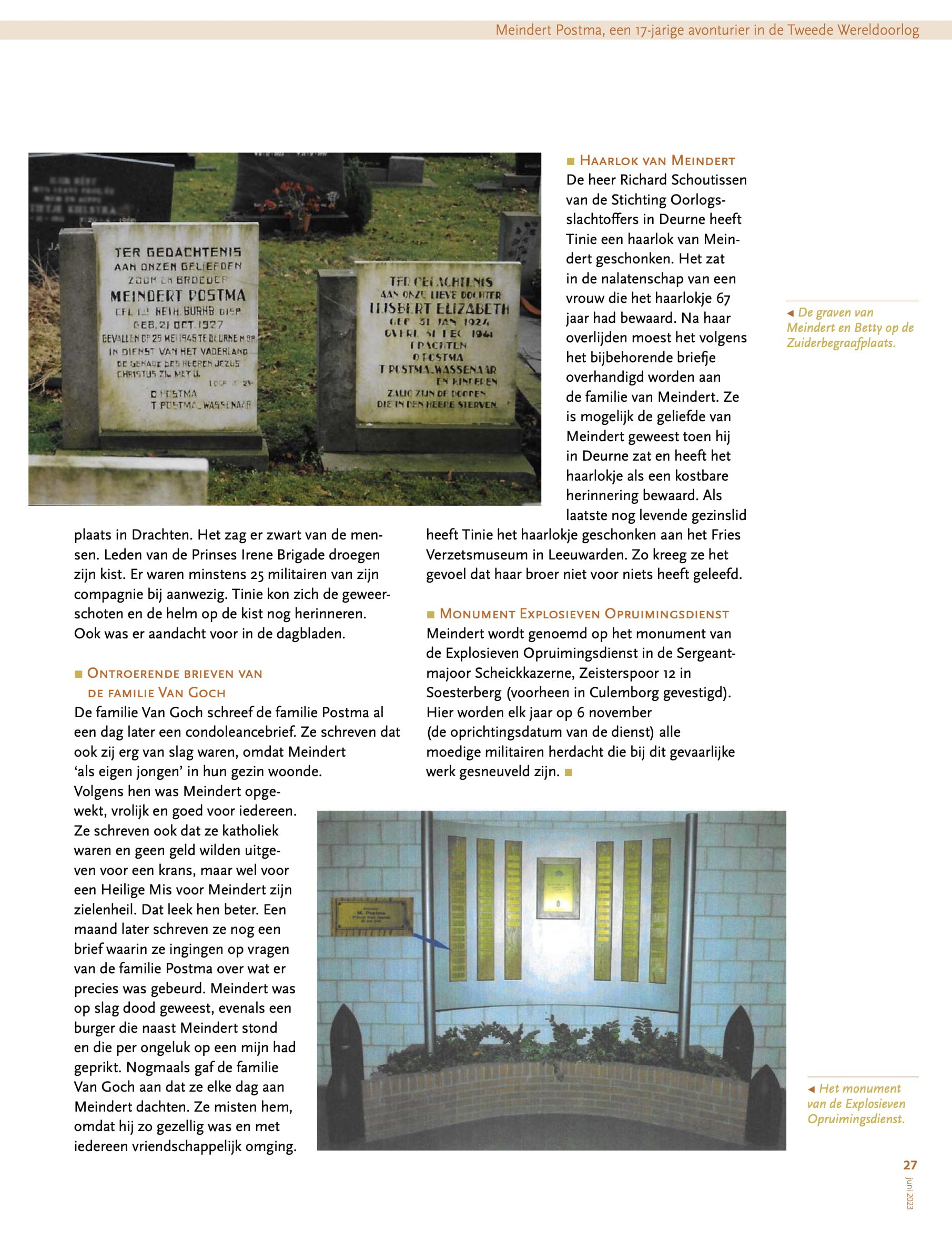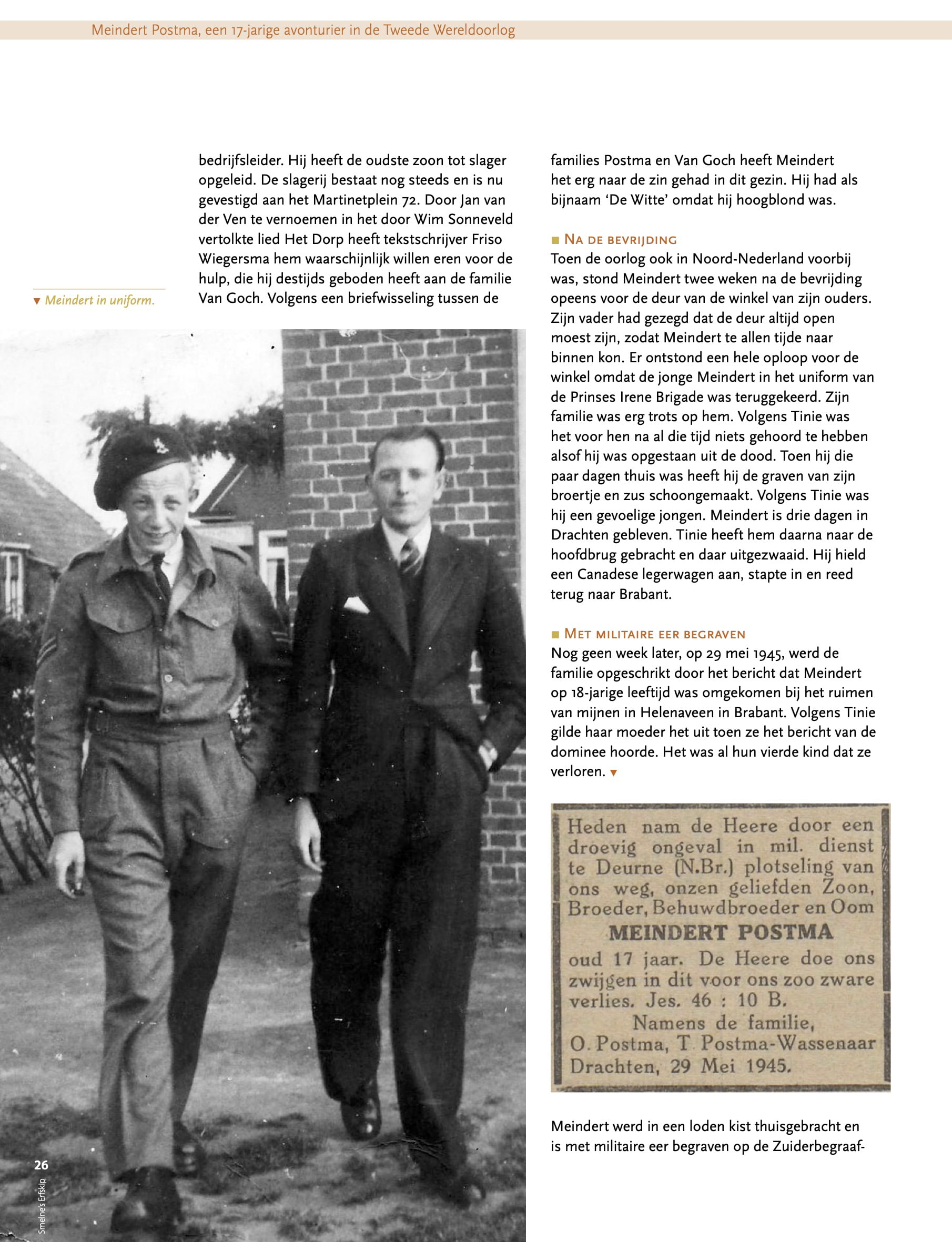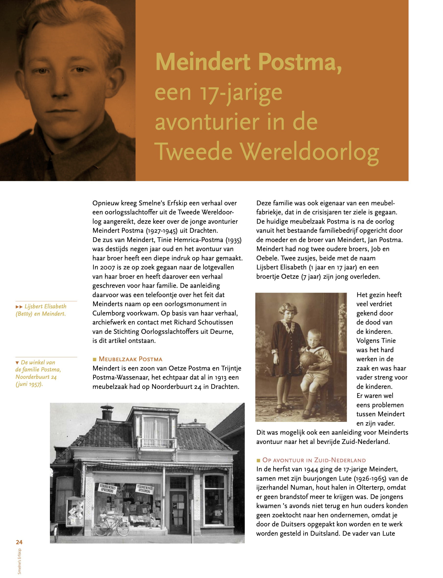 Beneden het artikel “Meindert Postma, een 17-jarige avonturier in de Tweede Wereldoorlog” gepubliceerd in het periodiek voor de cultuurhistorie van Smallingerland “Smelne’s Erfskip”.