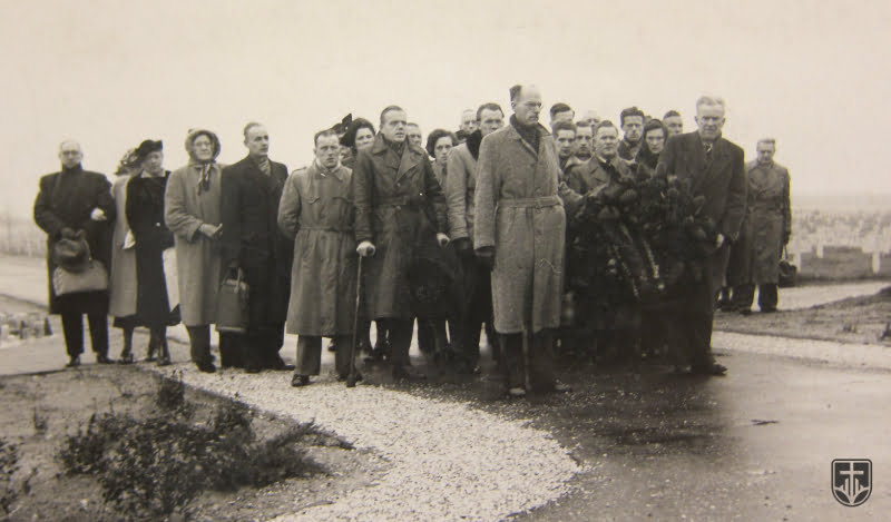 Boven: Kranslegging te Ysselsteyn in november 1952 door leden van het HIAG (afdeling Köln), Hilfsgemeinschaft auf Gegenseitigkeit der Angehörigen der ehemaligen Waffen-SS (Vereniging voor wederzijdse hulp van de leden van de voormalige Waffen-SS).